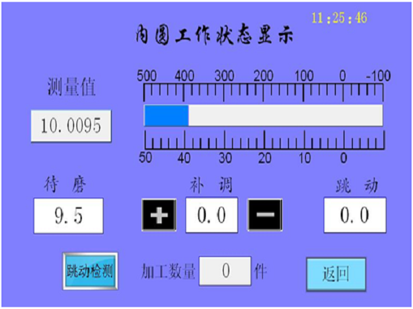 當(dāng)各種數(shù)值都設(shè)定好后,在“加工中操作面板”點(diǎn)擊“啟動(dòng)”按鈕,便進(jìn)入自動(dòng)測量狀態(tài)(儀器上電時(shí)自動(dòng)進(jìn)入)。外徑與內(nèi)徑對應(yīng)不同的工作狀態(tài)顯示界面,分別如下圖所示: